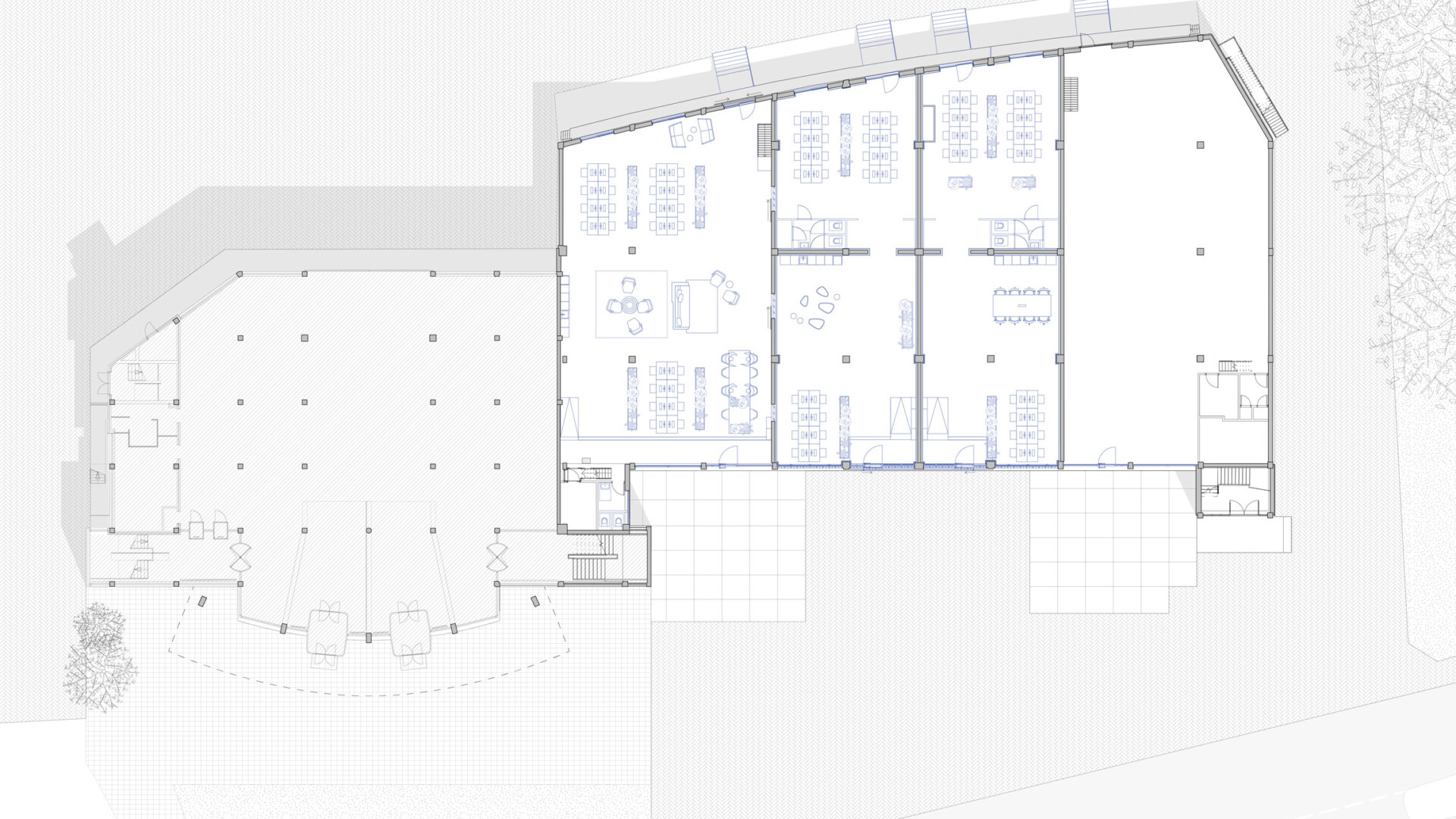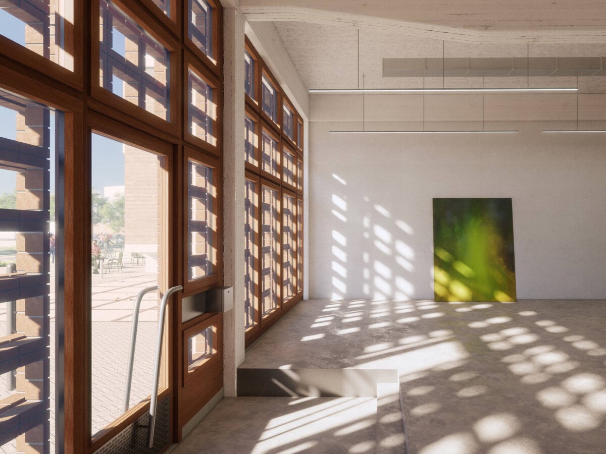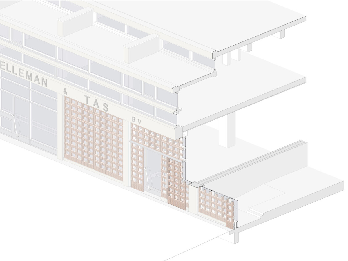 Along the southern façade, reclaimed bricks from the existing building are reassembled into an open masonry structure that brings daylight deep into the interior while simultaneously providing natural sun shading. The former loading bays on either side are transformed into open elements that reveal the new use of the building and align with the horizontal articulation of the upper level. In this way, the façade gains depth and permeability, without losing its characteristic order.