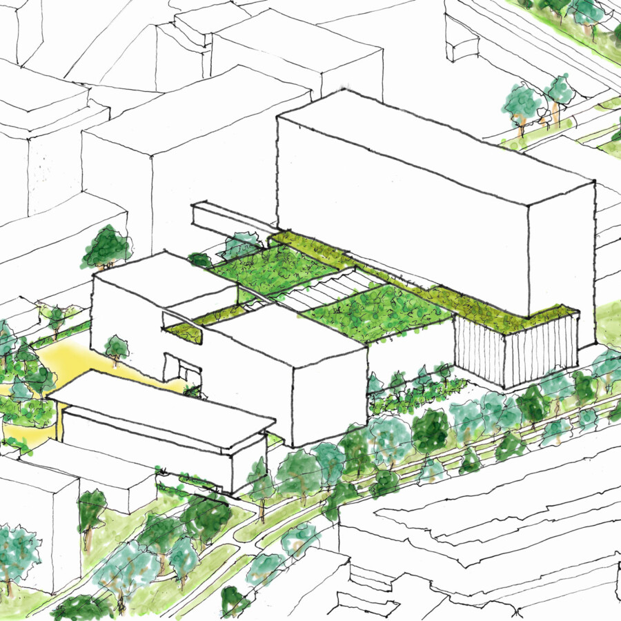 The building’s earth-toned façade and inviting entrance serve as a welcoming gesture, encouraging people to step inside. Once inside, visitors are immediately captured by the building’s dynamic, health-focused core: a three-level atrium that consolidates shared amenities to strengthen the community. A lush green roof garden is visible from the entrance hall, and a first-floor patio offers an immediate connection with greenery and nature.