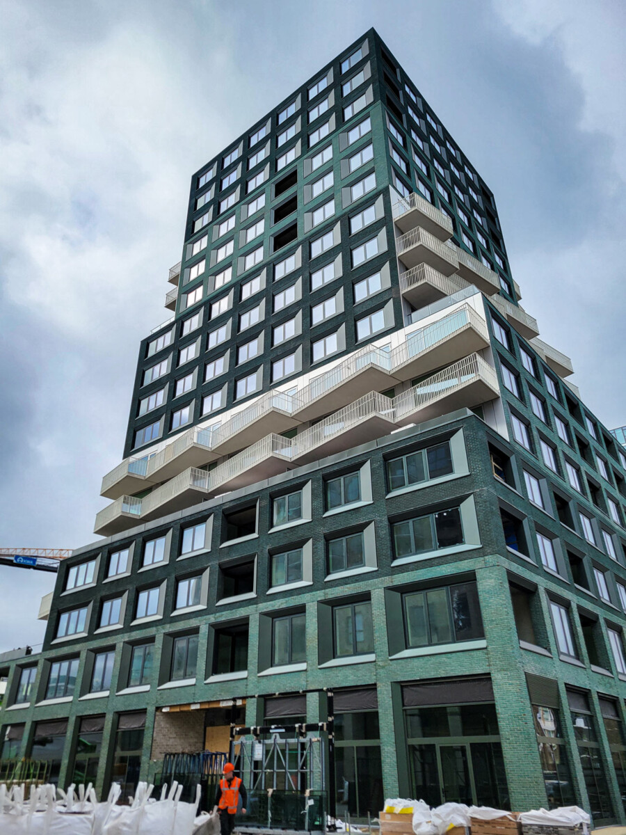 A contrasting palette of aluminium and triangular balconies is applied at each setback, bringing extra dynamics. It also creates a variety of outdoor areas, including loggias and deep terraces, offering residents rich and diverse living experiences. The expressive green brick of the base façade provides a distinctive appearance. The different stacked blocks share a single colour palette, but the variation of smooth and contrasting rough-ribbed bricks gives each block its own identity and breaks the scale of the volume.