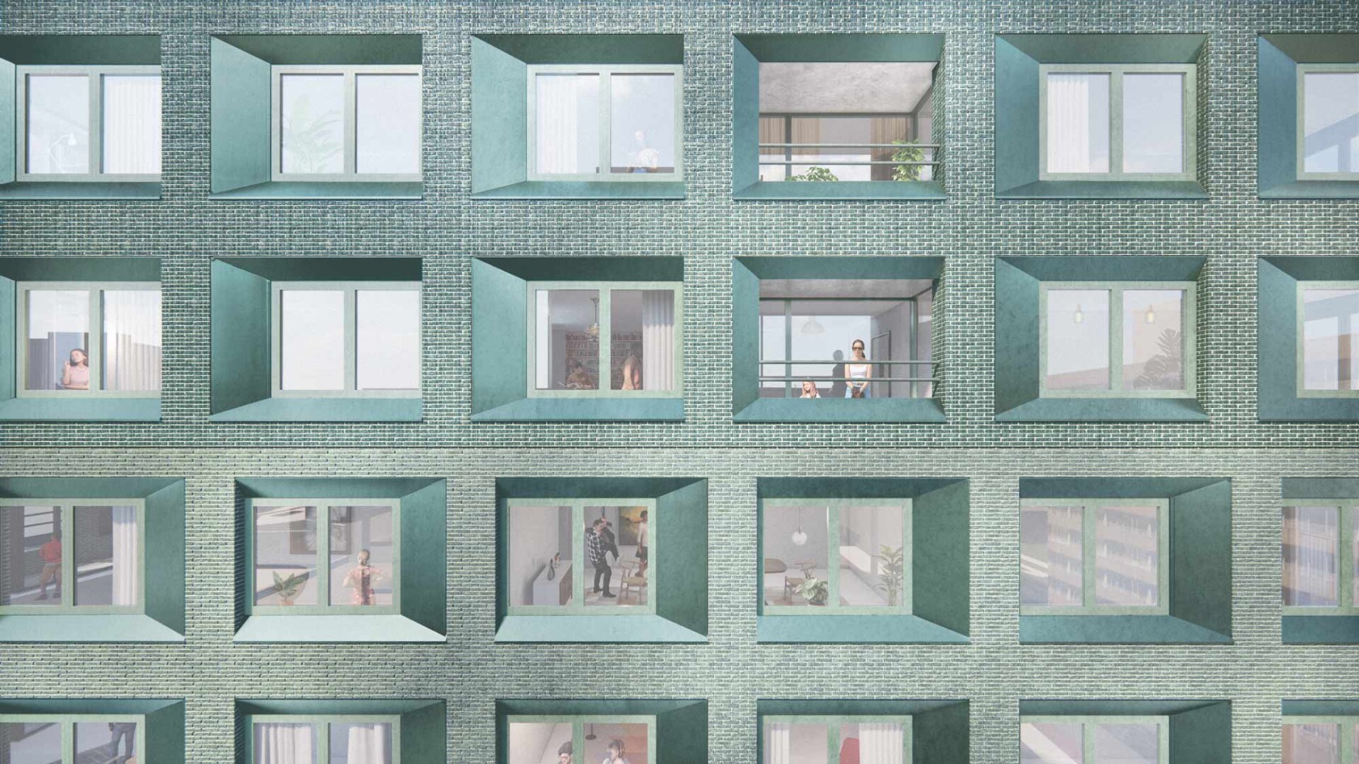 A contrasting palette of aluminium and triangular balconies is applied at each setback, bringing extra dynamics. It also creates a variety of outdoor areas, including loggias and deep terraces, offering residents rich and diverse living experiences. The expressive green brick of the base façade provides a distinctive appearance. The different stacked blocks share a single colour palette, but the variation of smooth and contrasting rough-ribbed bricks gives each block its own identity and breaks the scale of the volume.